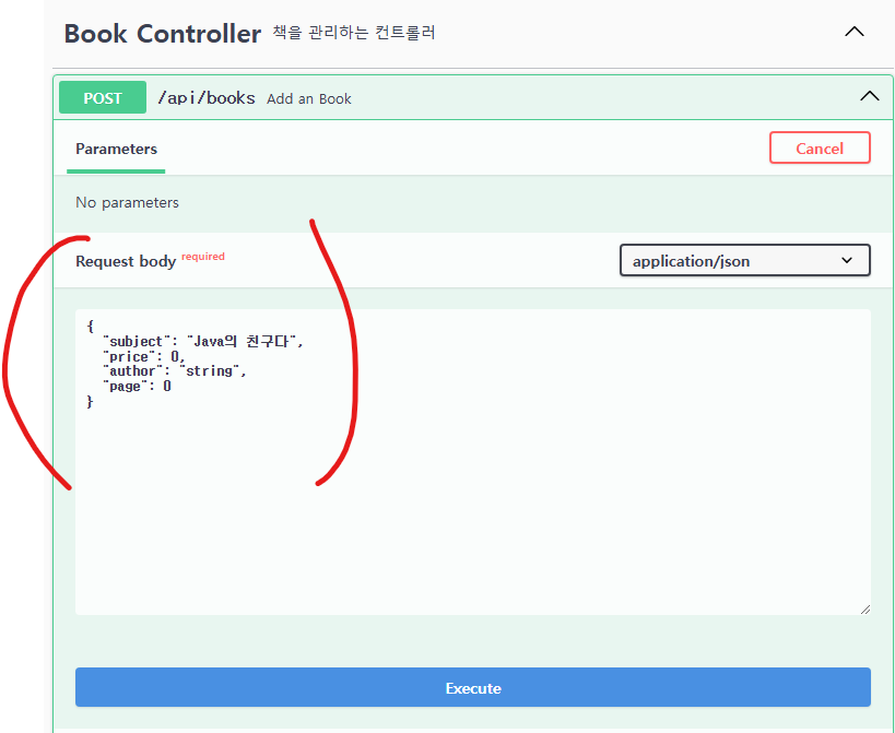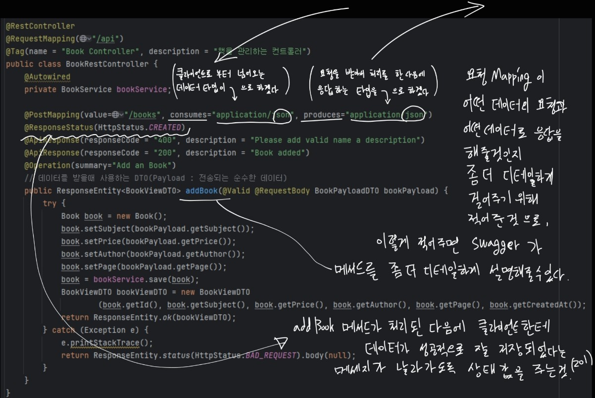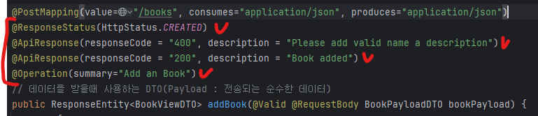 - @Operation(summary="Add an Book"): 메서드의 기능 요약을 설명합니다.
