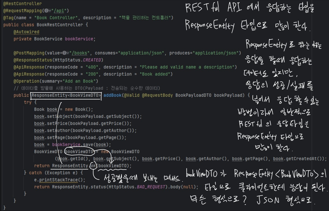 @ 어노테이션은 없지만, return ResponseEntity.ok(bookViewDTO); 에서 ok 가 200:OK 을 의미한다. 상태값 200 과 JSON 데이터 (bookViewDTO) 를 하나로 묶어서 응답하는 타입을 ResponseEntity 라고 부른다.