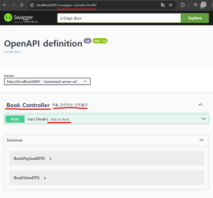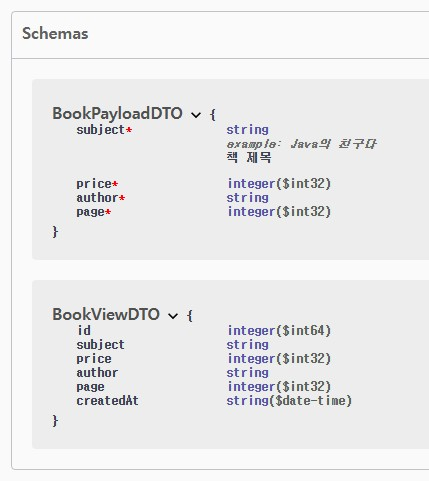 Schemas 라고 하는 부분의 > 표시를 다 열어보면, Swagger 가 BookPayloadDTO, BookViewDTO 의 코드까지 읽어서 Schemas 를 표시를 해놓은 걸 볼 수 있다.