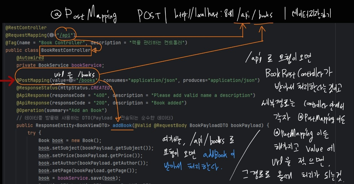 - @RequestBody를 통해 JSON 데이터를 BookPayloadDTO 객체에 매핑.