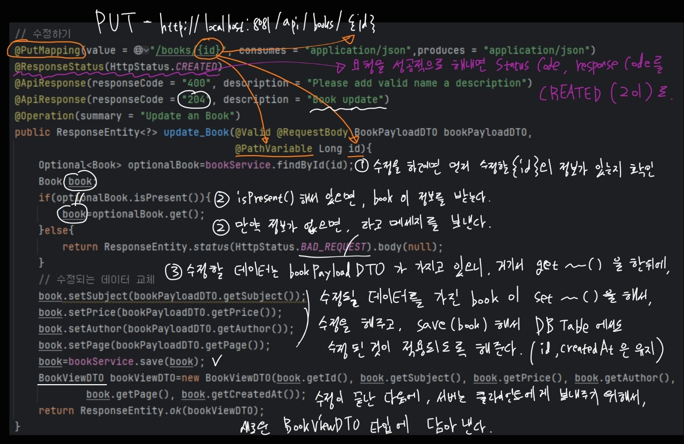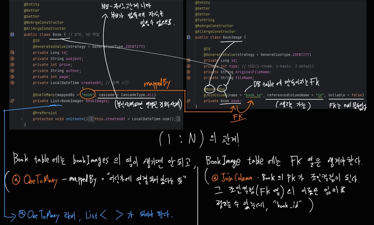 지금까지 Book 이라는 table 만 가지고, GET/POST/PUT/DELETE 를 해볼 수 있는 RESTful을 만들어봤었다.직전 게시글에서 전역 예외 처리에 대해서 공부했고,이제는 Book 이라는 table 말고도 다른 table 도 만들어볼 것이고, 그 table 간의 관계 설정도 해볼 것이다.책과 관련된 이미지를 업로드, 다운로드, 삭제 등을 RESTful API로 만들어볼 것이다. Book 이라는 Entity 를 만들었었다. 이제는 BookImage 라는 Entity 를 만들것이다. (table 이 될 것)책 하나에는 여러개의 책 이미지가 있을 수 있다. 교보문고 같은 책 판매 페이지를 보면, 알 수 있듯이 여러 개의 이미지가 등록되어 있을 수 있다. 그러므로 1:N 의 관계를 맺게 된다.B..